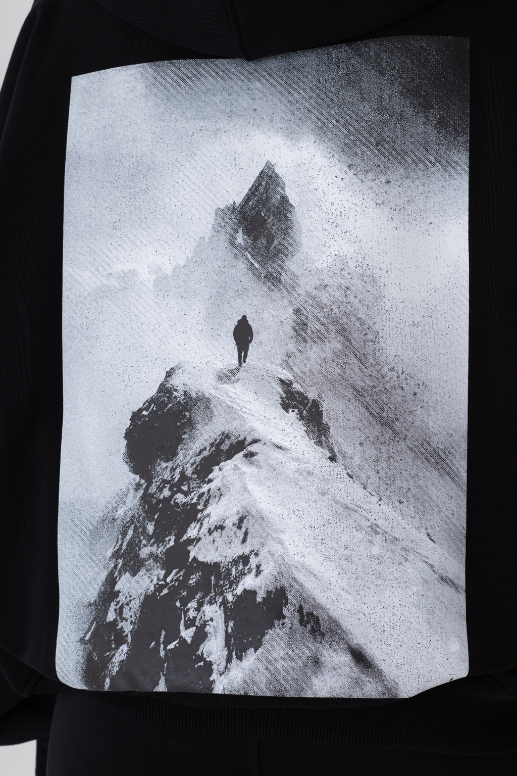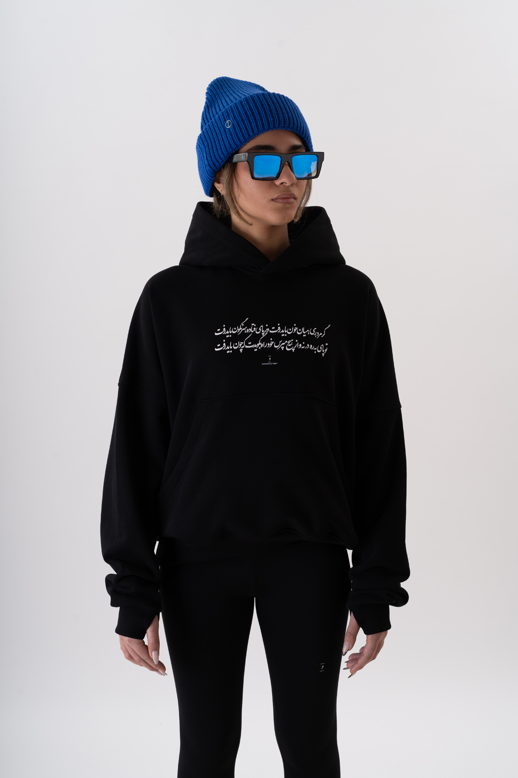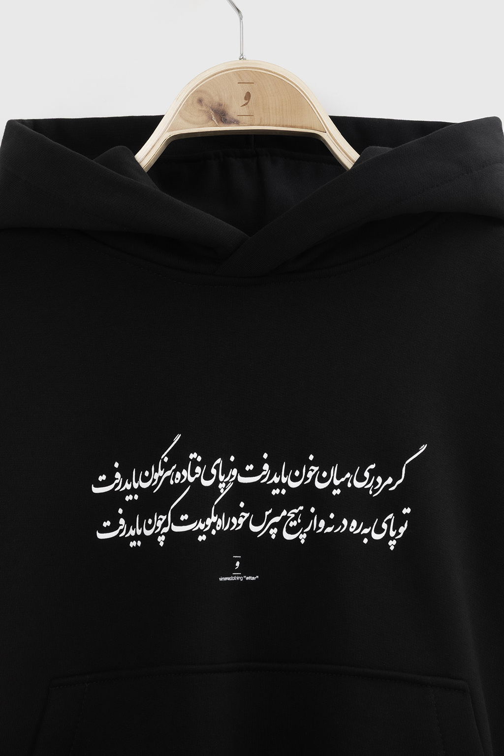 • پیش هودی متن فارسی با تکنیک چاپ سیلک اسکرین برجسته و پشت هودی تصویر کوه با تکنیک چاپ سیلک اسکرین اجرا شده است.