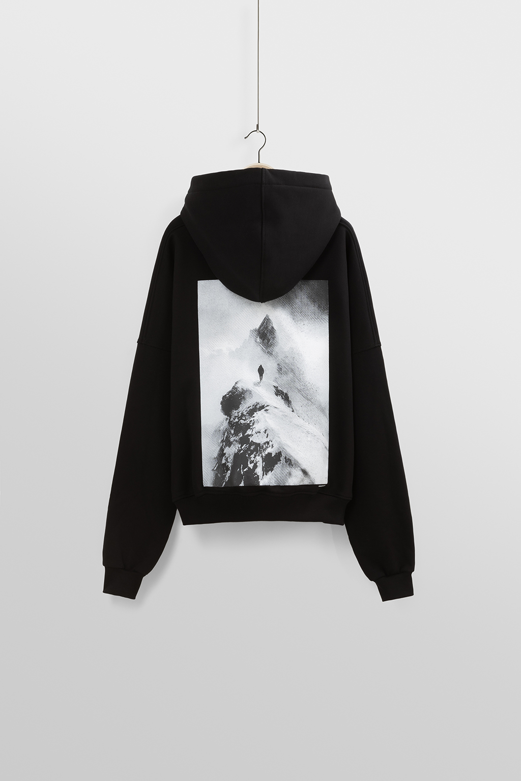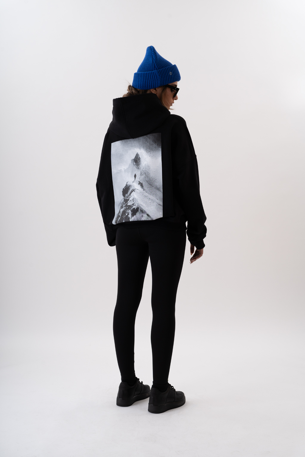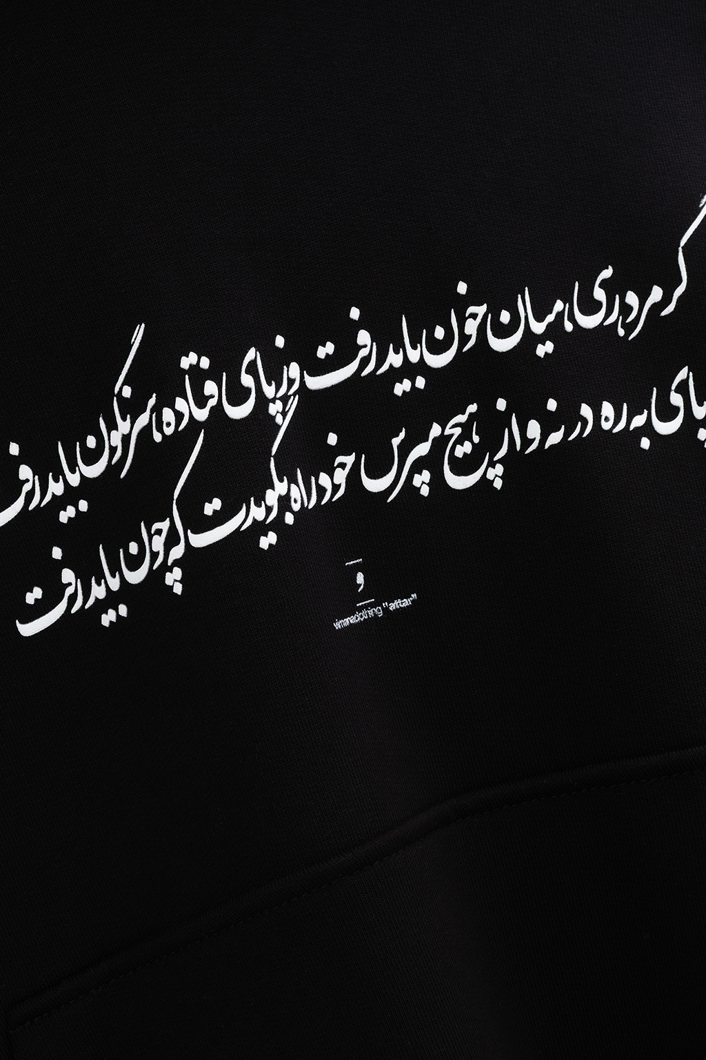 • پیش هودی متن فارسی با تکنیک چاپ سیلک اسکرین برجسته و پشت هودی تصویر کوه با تکنیک چاپ سیلک اسکرین اجرا شده است.