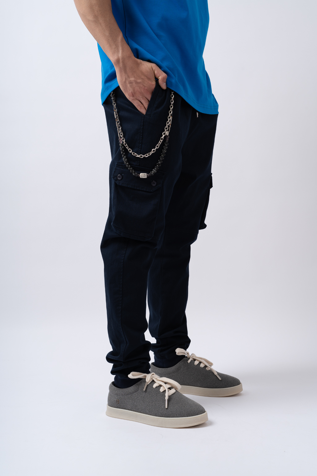 • حلقه نیم دایره روی سمت راست شلوار برای آویزان کردن زنجیر شلوار طراحی شده است.