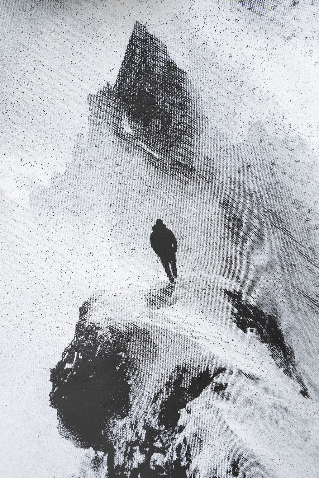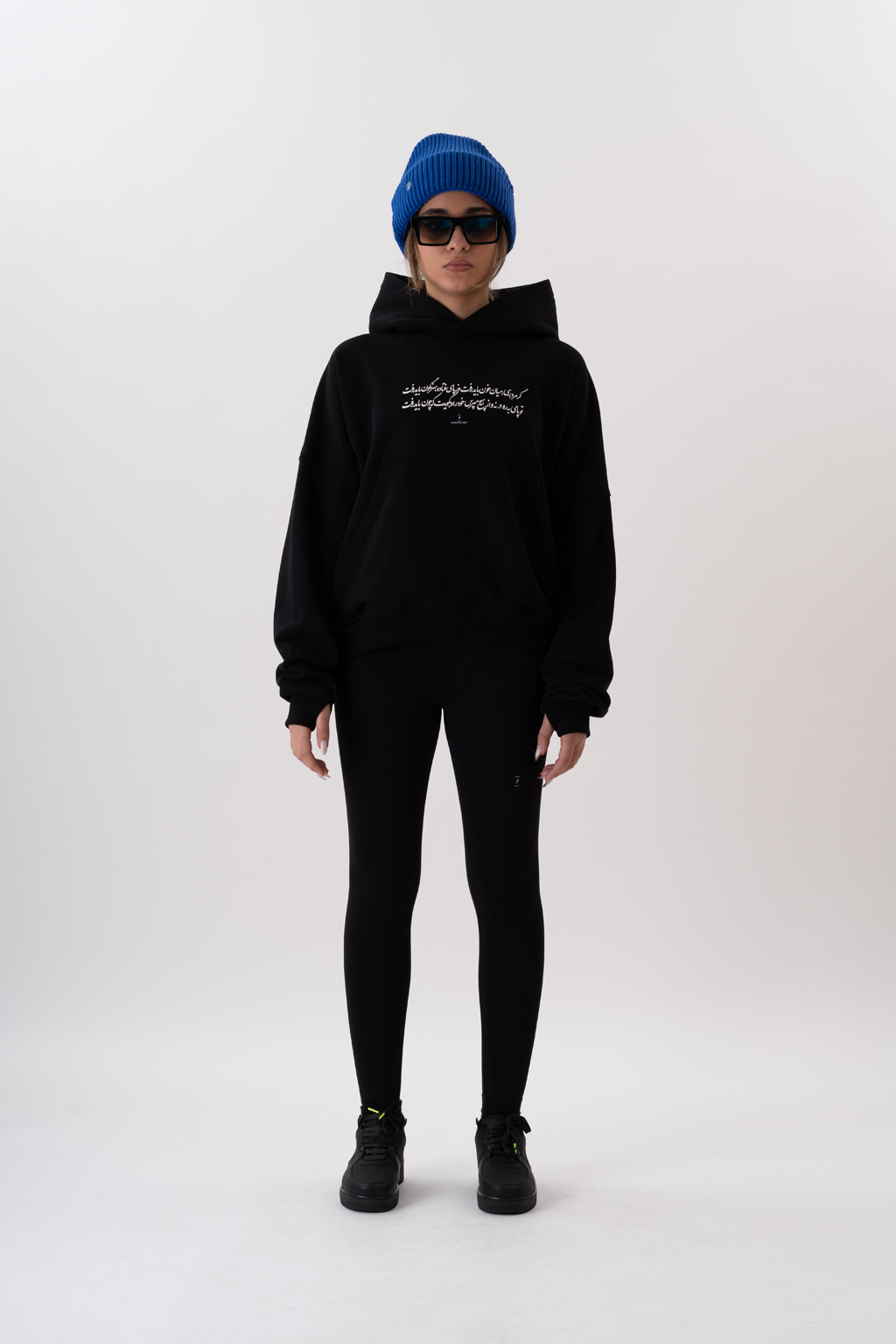 • پیش هودی متن فارسی با تکنیک چاپ سیلک اسکرین برجسته و پشت هودی تصویر کوه با تکنیک چاپ سیلک اسکرین اجرا شده است.
